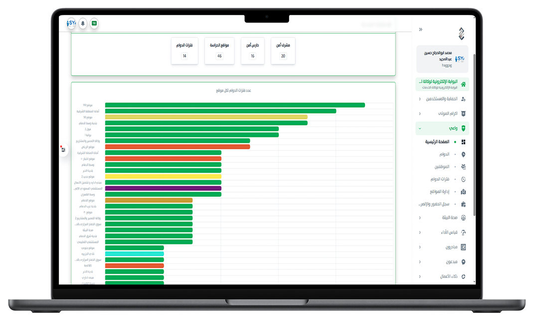 واجهة مرئية لعرض حالة كل نقطة أمنية وعدد المناوبين فيها مع احصائيات وتقارير بالأداء والانضباط ومؤشرات لقياس كفاءة التوزيع والاستجابة للحالات